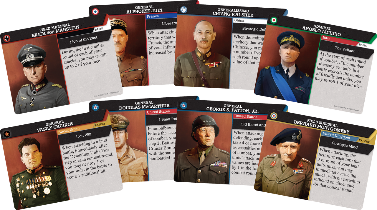 Axis & Allies: Commanders introduces Admirals and Generals from 9 different countries, plus two WWI Supreme Commanders, each with power-specific abilities that can be used in any version of Axis & Allies. This accessory features all-new artwork of every commander!