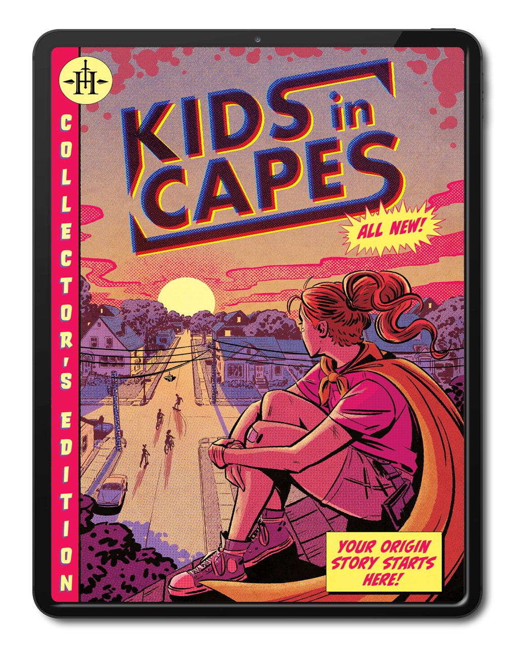 Kids in Capes is a brand-new spin-off roleplaying game of the ENnie award-winning Kids on Bikes! This new game updates the classic rules that Kids on Bikes fans love, while offering a chance for players to explore the world of superheroes along with their friends!